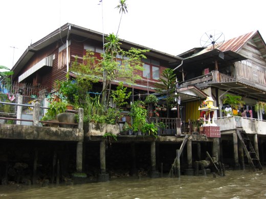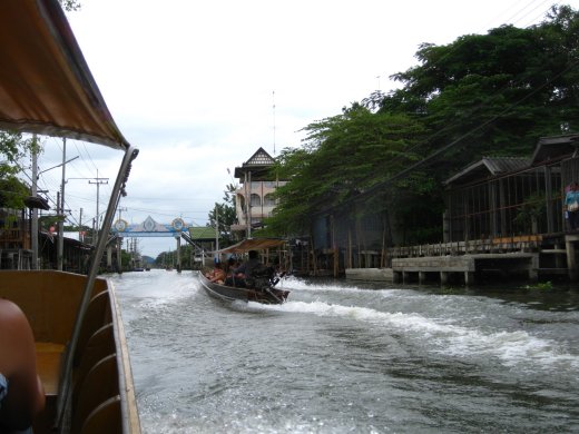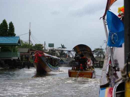 Na een klein uurtje op het water wat handel te hebben gedreven, worden we afgezet bij aan de oever verankerde winkels alwaar we op souvenirjacht gaan. Via een aantal naburige khlongs wordt de terugtocht aangevangen in longtail-boats, waarbij er af en toe hard over het water wordt gescheurd. Botsingen door verkeerd ingeschatte vaargeulen behoren dan helaas tot de mogelijkheden.