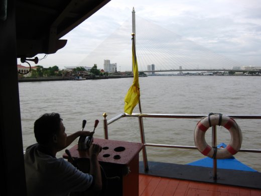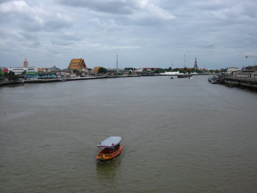 De Chao Praya is de belangrijkste waterweg van Thailand. Enorme bruggen overspannen de breedte van deze koningsrivier. De Rotterdammers onder ons mijmeren over hun zwaan bij het zien van deze brug.