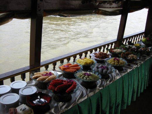 Tijdens de tocht over de verschillende wateren van Bangkok wordt ons een heerlijke sortering fruit aangeboden. De een na de ander breekt zo steeds maar weer een versiering aan stukken.