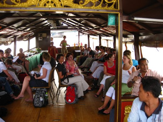 Na de fruitproeverijen luistert de hele groep met (on)verdeelde aandacht naar de verhalen van onze bijzondere gids Hattha. Zelfs de schipper kijkt verbaasd achterom om de impact van de verhalen te aanschouwen.