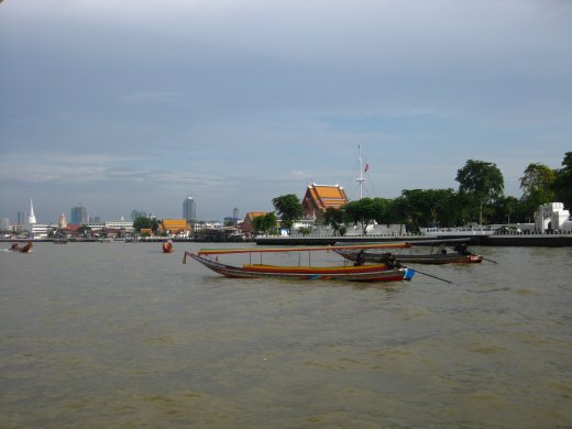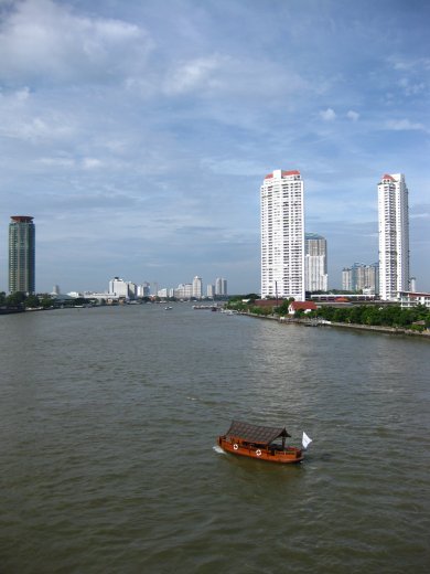 Aan de rand van het centrum staan verscheidene wolkenkrabbers, maar om de toeristen te plezieren vaart men nog steeds -of liever juist- rond met ouderwetse boten. Op de brede rivier vallen deze scheepjes bijna in het niet...
