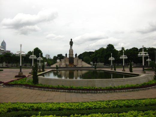 Een groepswandeling brengt ons naar het Lumphinipark waar we aan de kant van de Silom het beeld aanschouwen van Rama VI, de koning die het Lumphinipark in 1925 opende. Maar daarvoor hebben we wel de warmte, de vochtigheid en de enorme drukte en stank van het verkeer van Bangkok moeten trotseren.