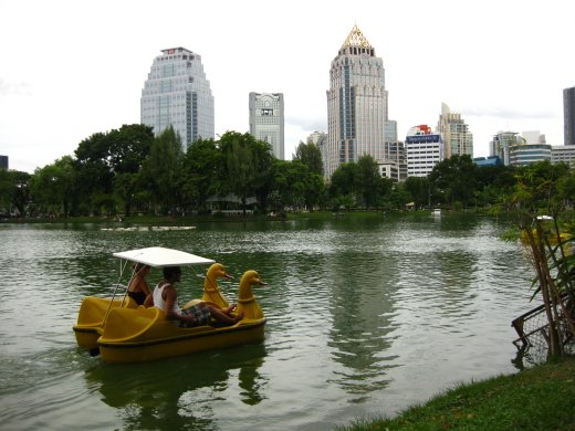 Het groene Lumphinipark dat zich uitstrekt rond twee vijvers is een welkome oase na de drukke straten van Bangkok waarvan de skyline op de achtergrond goed te zien valt. In een vage herinnering doet dit een beetje aan het uitzicht over de Kralingse Plas denken...