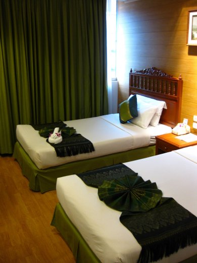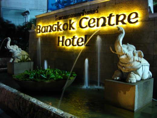 Aan de overkant van het station ligt ons hotel, het Bangkok Centre Hotel met zijn fraaie entree. Steeds als we bij het hotel aankomen zijn we blij de klamme warmte van Bangkok te kunnen ontvluchten.