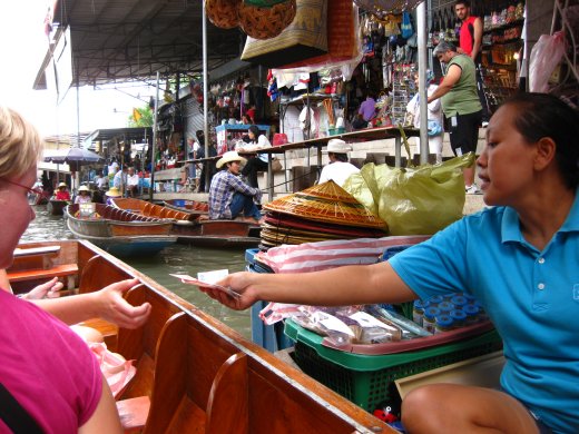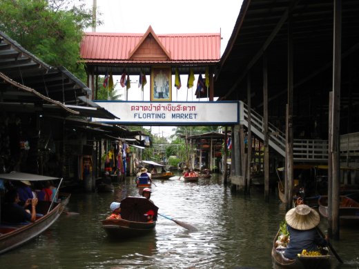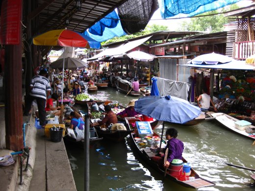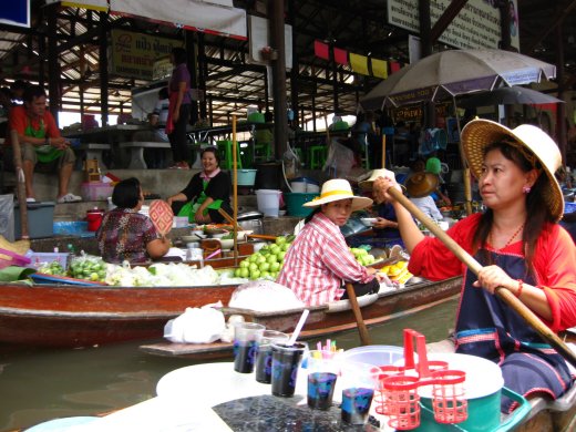 Tientallen boten liggen dicht opeengepakt in de khlongs en elke boot zakt diep in het water onder het gewicht van vis en stapels fruit zoals superverse mango of ananas. Men marchandeert en dingt af in een oorverdovend lawaai van schreeuwen, lachen en verongelijkt kijken. Dit levert een wonderbaarlijk kleurrijk schouwspel op.