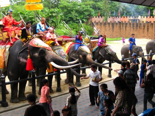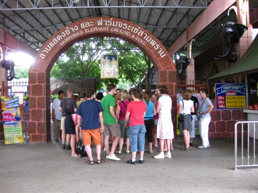 De bus brengt ons weer naar een eetgelegenheid voor westerse magen... Omdat het na de lunch al tegen drieën loopt, besluiten we de wervelende shows van het Samphran Elephant Ground & Zoo te bezoeken om te bezien of het echt zo spannend is als de brochure ons doet geloven.