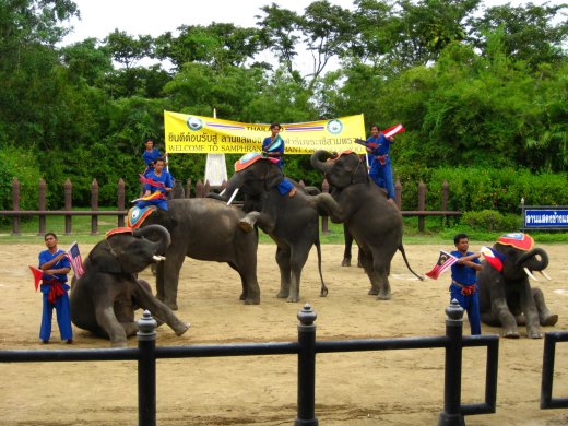 Een groep olifanten komt het veld, de Samphran Elephant Ground, opdraven en vertoont allerlei grappige kunstjes en dansjes, waarbij we telkens weer verrast worden over de fratsen die ze uithalen.