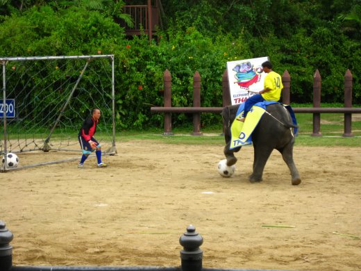 Een doel wordt het veld opgesleept en één voor één mogen de olifanten een schot op het doel wagen. Sommige olifanten nemen de bal met hun slurf mee, plaatsen die op de grond en schieten zo vrij hard op doel. De trainingen voor de Elephant World Cup Thailand 2009 zijn in volle gang!
