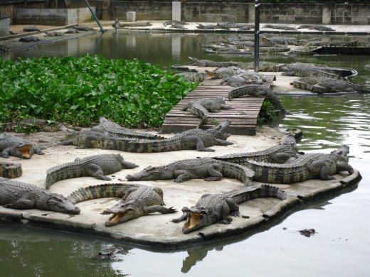 Na de olifantenshow lopen we langs het krokodillenverblijf, alwaar de verraderlijke krokodillen zich erg lui voordoen, maar bliksemsnel in actie komen als er wat hun kant op wordt gegooid.