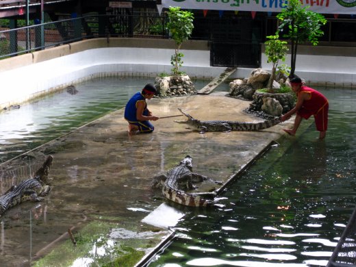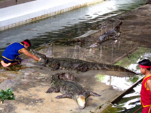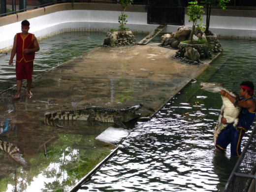 Even verderop vangt de Crocodile Wrestling Show aan. Twee krokodillentemmers spelen met de krokodillen om de reactiesnelheid te testen op het dichtklappen van de bek.