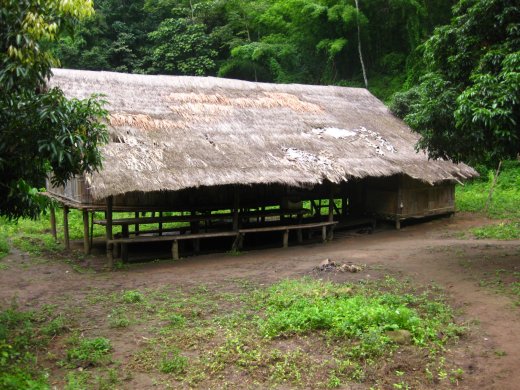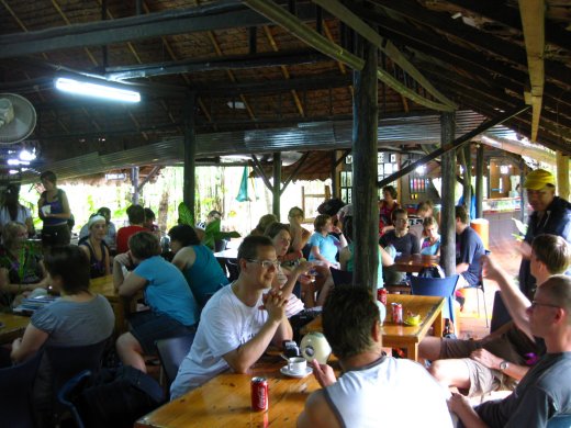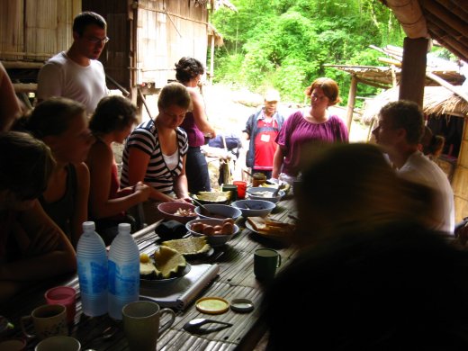 Als we in het centrum arriveren, horen we dat degenen die daar sliepen een wat onrustige nacht achter de rug hebben vanwege een aantal rondscharrelende kippen en een tweetal varkens dat probeerde rond te neuzen. De huizen, gemaakt van bamboe, zijn vrijwel zonder uitzondering op palen gebouwd en eronder kunnen de dieren hun gang gaan... We genieten die ochtend van een vrij westers ontbijt: toast, jam, koffie of thee, eieren en vers fruit: overheerlijke ananas.