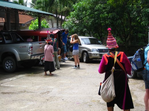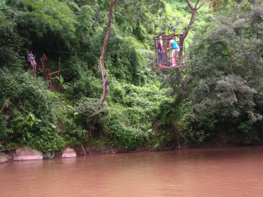 Met de songthaew, een op een jeep lijkende overdekte pick-up truck waarbij we achterin op twee bankjes zitten, worden we over een weggetje met aardig wat kuilen en hobbels vervoerd. We worden afgezet bij een stellage met een stalen kooi aan een kabel. Hierin moeten we onszelf naar de overkant van het riviertje trekken.