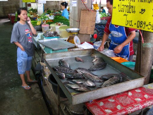 We krijgen een half uurtje de tijd om rond te dwalen op deze ochtendmarkt. Bij de eerste de beste kraam zien we vissen naar adem zien happen, hoe onverkwikkelijk... Hieraan kun je toch merken dat je opeens in een heel andere cultuur verzeild bent geraakt.