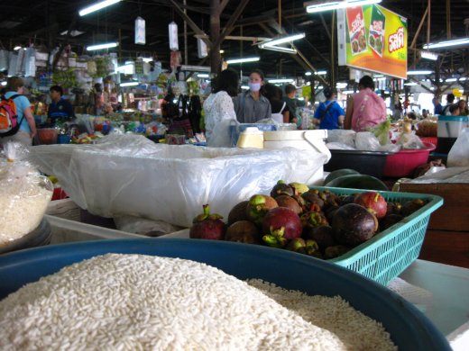 We struinen de markt gauw verder af en komen bergen rijst tegen. Dit is echt een lokale markt, we worden namelijk niet aangeklampt om iets te kopen en er zijn weinig toeristische artikelen te vinden. Eindelijk kunnen we eens ongestoord en op ons gemak het marktgebeuren bekijken.