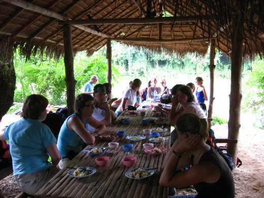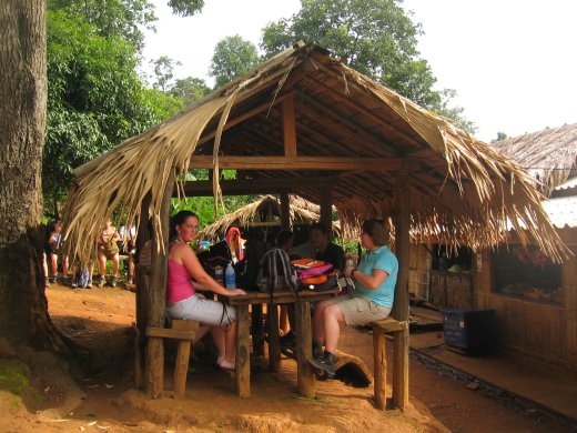 Vanochtend hebben we de meeste bagage (de koffers) in het hotel achtergelaten en alleen een volgepropte rugzak meegenomen; de Mae Tang Jungle Tour staat op het punt te beginnen! Onze grote groep wordt in drie groepjes verdeeld; één groepje gaat al op pad voor de olifantenrit, de twee andere groepjes krijgen eerst een lunch voorgeschoteld.