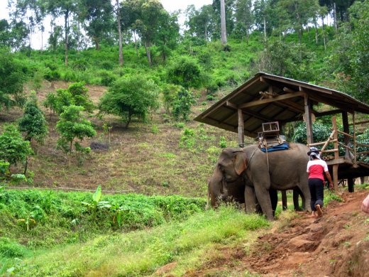 Na een kleine wandeling door de bushbush moeten we tussen twee olifanten doorlopen om het platform te beklimmen. Vanaf dit platform klimmen we op het draagstoeltje (bankje) op de rug van de olifant; de olifantenrit is begonnen!