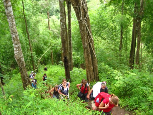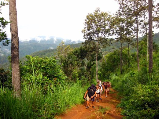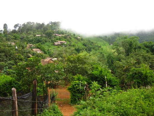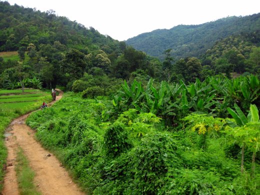 Het dorpje waar we overnachtten lag op ongeveer 350 meter hoogte, maar nu naderen we al de 1000 meter. We hoeven ons niet meer door de jungle te worstelen, omdat we nu gewoon de rotsachtige zandweg en smalle paadjes kunnen volgen naar het volgende bergdorpje. Deze weg loopt echter erg steil omhoog, we moeten dus klimmen, klimmen en nog eens klimmen. Het psychologische effect van druivensuiker versnelt de pas echter aanzienlijk.