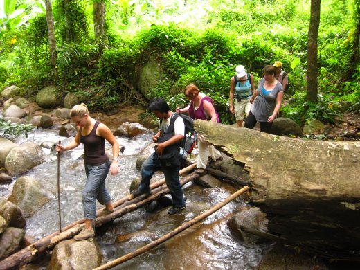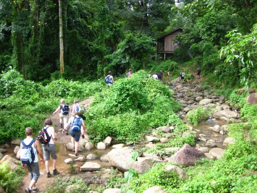 Na de olifantenrit vangt de junglewandeling aan, in een vrij vlak gebied, maar al snel begint de omgeving te stijgen en te dalen en moeten we geregeld wat stroompjes zien te overbruggen. De warmte wordt goed gevoeld en het backpack werkt ook niet mee; even later hebben we allemaal last van een vrij zoute druppeldouche.