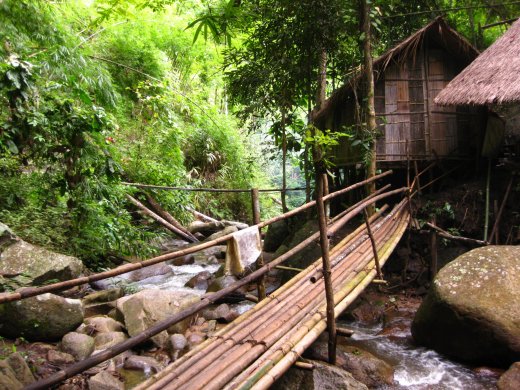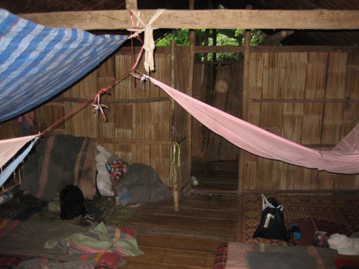 Sommigen bezoeken eerst nog even het toilet, dat eigenlijk niet meer is dan een hutje met daarin een gat in de grond. Dat hutje blijkt al wel bezet te zijn door een wat groot uitgevallen achtpotig insect. In de slaapruimte, een grote bamboehut, vinden we op de bamboehouten vloer met behulp van een zaklamp voor iedereen een matrasje, lakenzak en hangt er ons nog iets boven het hoofd: een klamboe. Vlak naast elkaar brengen we zo de nacht door, hoe avontuurlijk!