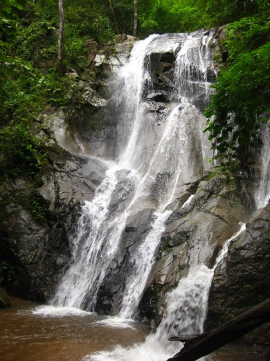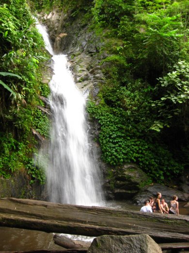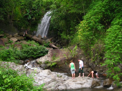Via een aantal grote keien in het beekje zelf of via een enorme boomstam bereiken we de overweldigende waterval. We laten ons in het koude water zakken en proberen even onder het donderende geraas van de waterval te gaan staan. Dit is toch maar moeilijk vol te houden. In het bassin van de waterval genieten we van het verkoelende water en mijmeren relaxed over deze onvergetelijke ervaring. Met meegebrachte shampoo nemen we zelfs nog even een watervaldouche...