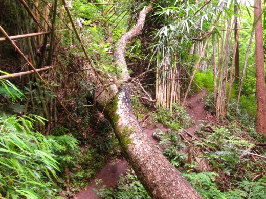 In het begin waren de paadjes nog vaak rotsachtig, maar later treffen we steeds meer glibberige klei. Dit bemoeilijkt het lopen wel, we moeten dan ook goed opletten waar we onze voeten plaatsen, want op schuine stukken dreigen we soms weg te glijden... En wat voor wandelpad moet doorgaan, loopt langs steile diepten... We komen ook regelmatig obstakels tegen die ons echt de weg versperren. De vraag is dan of we eronderdoor kunnen, eroverheen of erlangs, maar steeds is het weer behelpen.