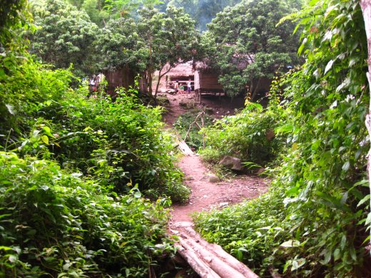 Het is erg warm en het zweet gutst en gutst maar en we vragen ons af wanneer we onze bestemming bereikt zullen hebben, als we opeens vanuit de dichtbegroeide jungle een dorpje zien liggen. Een aantal dorpsbewoners heeft ons ook ontdekt en gebaart dat we naar hen toe moeten komen.