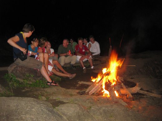 Tijdens de overheerlijke maaltijd, bereid door deze Kariang (Karen) stam, valt de duisternis al. Even later wordt er wat hout gesprokkeld en een vuurtje gestookt. We zoeken allemaal een grote kei of wat anders uit en gaan gezellig rond het kampvuur zitten. Een aantal jonge kinderen kan de slaap nog niet vatten en dwaalt rond de groep; regelmatig toveren ze een glimlach tevoorschijn.