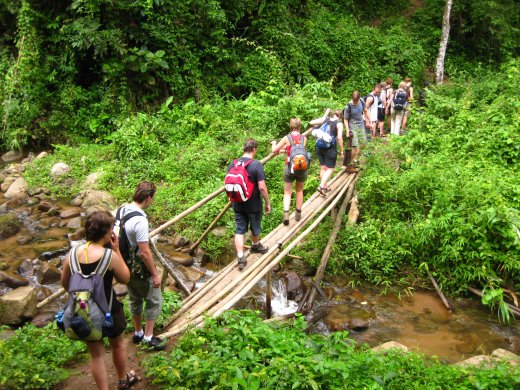 Onderweg horen we het ruisen van een waterval. Sommigen kunnen het niet laten om even de gebaande paden te verlaten en over wat rotsen te klauteren om een blik te werpen op de hoge waterval. Maar niet te lang, want achterblijven is geen optie... Het is belangrijk dat ieder in z’n eigen tempo loopt. Logischerwijs ontstaan er dan qua wandeltempo verschillende groepjes. Echter, aangekomen bij een van de weinige splitsingen vraag je je dan af: welke kant moeten we op? Een verkeerd pad inslaan lijkt ons geen goed idee. Er lopen gelukkig dragers annex gidsen vooraan én achteraan. De drager die de achterhoede vormt komt al gauw aanlopen en wijst de goede weg aan: we kunnen de tocht weer voortzetten!