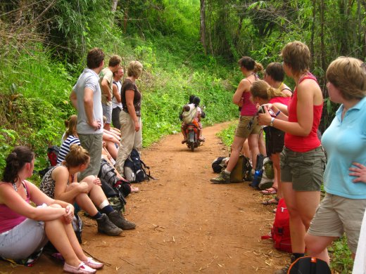 Vanwege het onderling verschillende wandeltempo en doordat sommigen wel en andere geen foto’s maken, raakt de groep steeds meer gesplitst, totdat hij uiteindelijk helemaal uiteen is gevallen. Bij de plek waar de gids is gestopt voor een kleine rustpauze, komen de wandelaars zodoende achter elkaar aanlopen, gelokt door de junglemuziek.