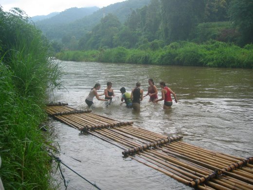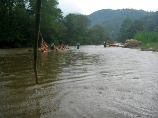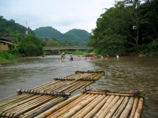Het wordt bamboo-rafting genoemd, maar het lijkt eigenlijk meer op bamboo-floating, alhoewel we wel een paar stroomversnellingen tegenkomen. De ergste hiervan, noemen we voor het gemak ook maar The Big One om te zorgen dat iedereen zich schrap zet, voor zover dat gaat dan... Met de vaarboom wordt geprobeerd aanvaringen met grote keien in het water te voorkomen en achteraan worden we begeleid door een Thai die mede zorgt voor de besturing van het vlot.