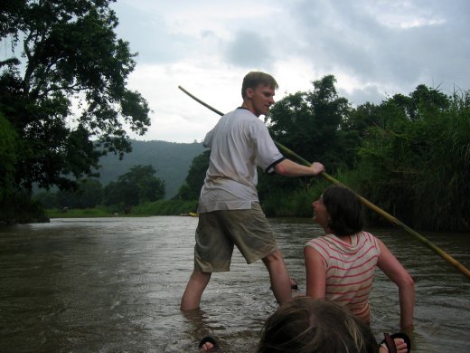 Een fotocamera werd ternauwernood meegesmokkeld op het vlot en gaat van hand tot hand om onder andere de bamboevlotschipper op de foto te kunnen zetten. Deze schipper stuurt het vlot door de stok op de bodem van het vaarwater te plaatsen en tegen het andere einde te duwen. Tevens wordt deze lange boom ook gebruikt om het schip voort te bomen, hoewel deze vlotvaart stroomafwaarts gaat. We laten het bamboevlot dan ook regelmatig rustig met de stroom meevoeren langs de prachtig begroeide oevers, waarbij we ook nog aan een aantal olifanten voorbijgaan.